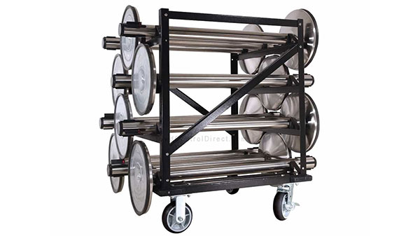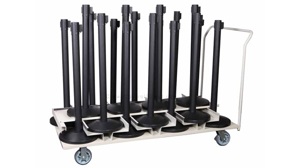 A set of 18 Retractable 11' ft. Belt Stanchions with Horizontal Storage Cart.